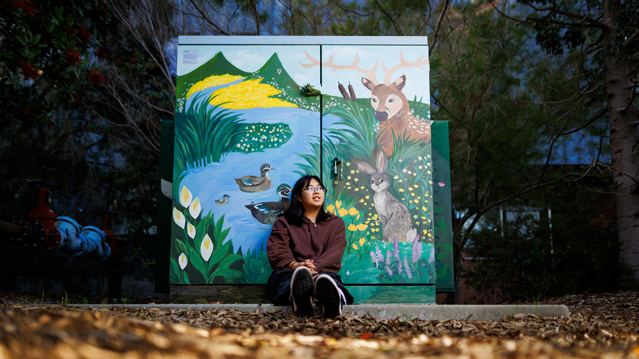 Electrical engineering student Victoria Dai in front of a campus utility box she designed and painted last fall.